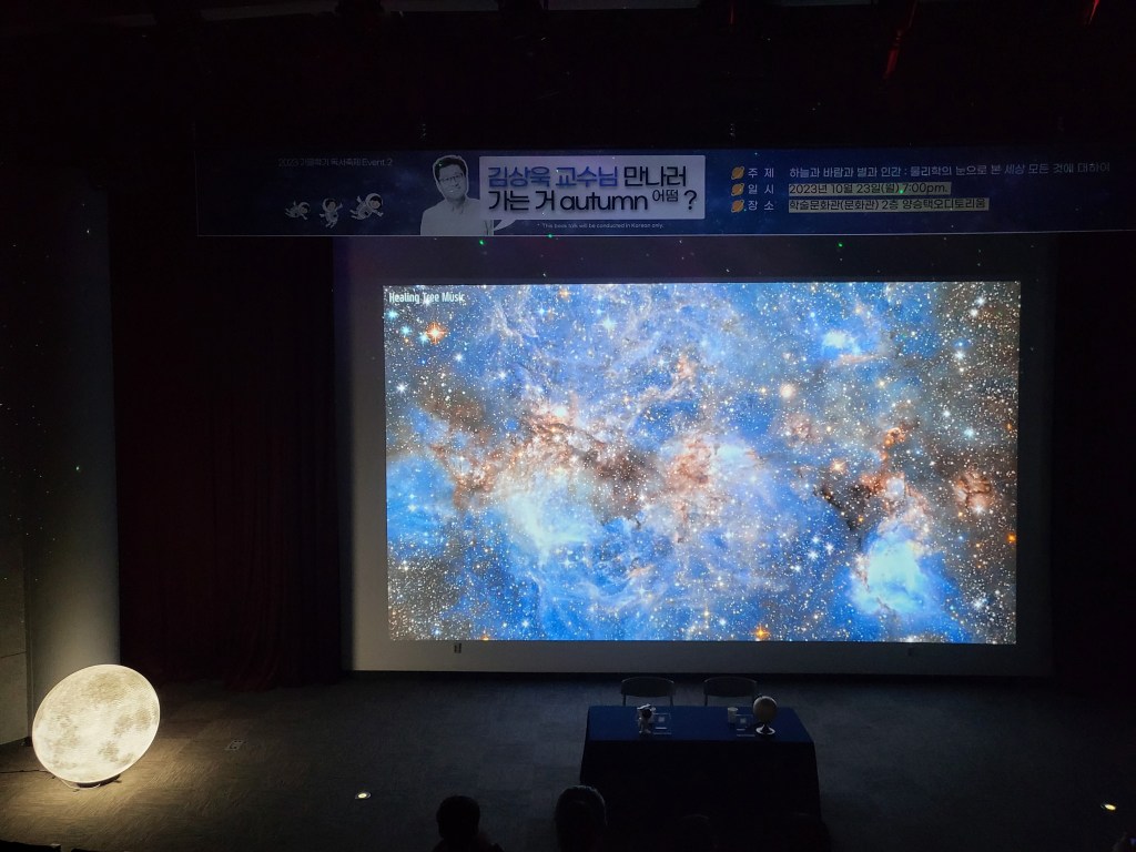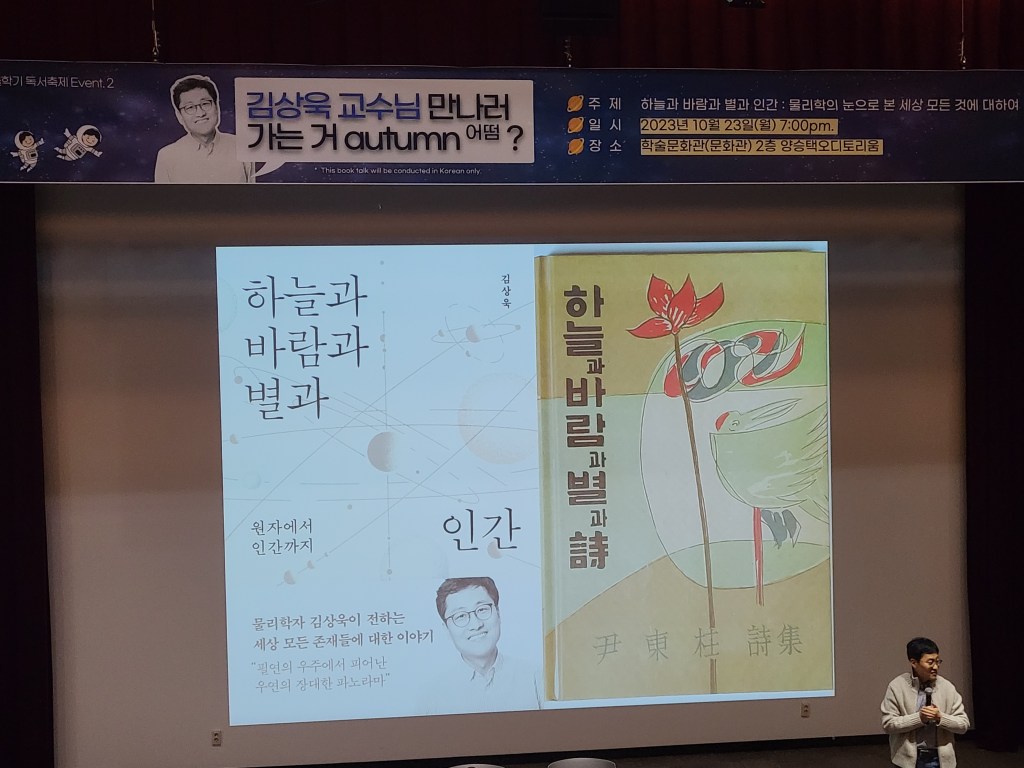 학교에서 김상욱교수님 북토크 강연이 있어서 참석했다. 오디토리움 자리가 다 채워질 정도로 인기가 많았다. 새로나온 책을 안 읽어봤는데 요약 내용을 담은 강연을 들었으니까 이제 책을 읽은 것처럼 약간 꾸며낼 수는 있을 것 같다.